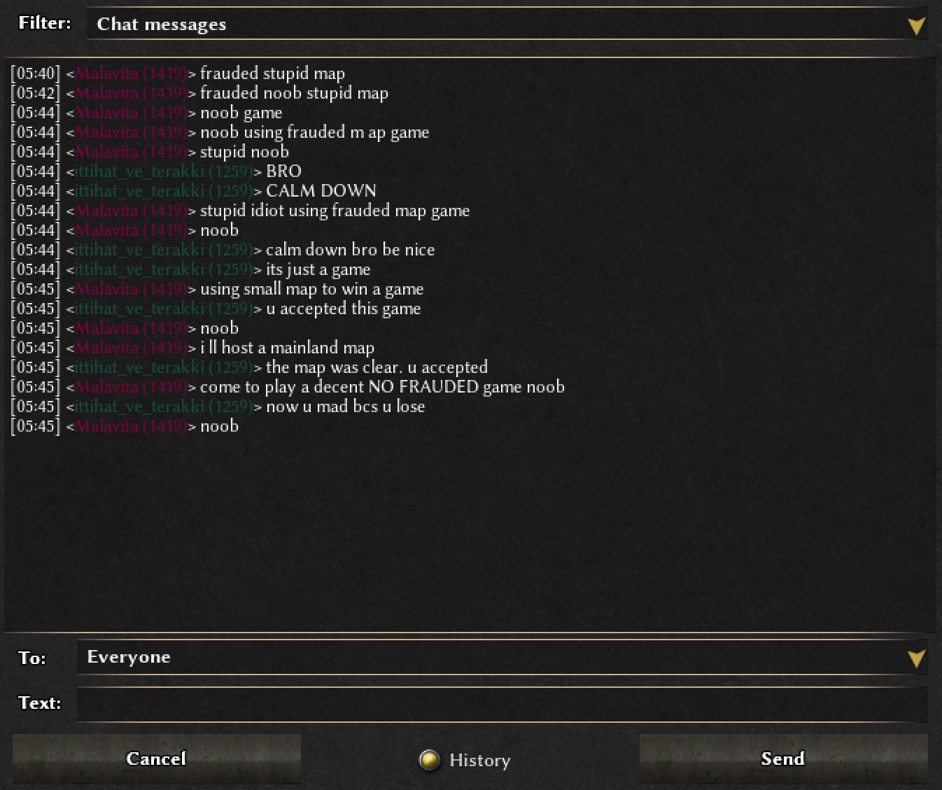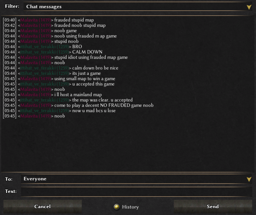 commands.txt @user1 This is a report regarding the player “Malavita” My lobby name is "ittihat_ve_terakki" He joined a 1v1 game that I was hosting. The game started normally, but when he realized he was about to lose, he began insulting me and behaving in a toxic manner. The game was actually unrated, but instead of resigning properly, he quit the match. He also accused me of choosing the map unfairly, even though he accepted the map at the start and raised no objections until he was losing. I am reporting this behavior as it is unsportsmanlike and disruptive. -