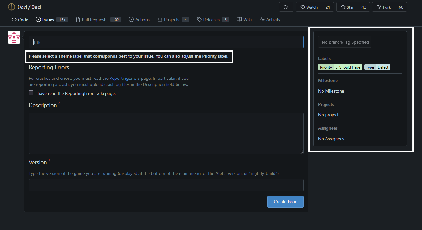 Whenever I want to create a Defect- or Enhancement-Issue on Gitea, I'm told the following: That is counterfactual: I am not able to change any of the values in the right sidebar (see attached screenshot). I don't feel the need to get this power, but it confuses my from time to time. Is it the aim, that bug reporter shall change the values themselves (like back in the old days on trac) or is this an artifact, that should be removed, if time permits? Disclaimer: I didn't file a bug in 0ad/0ad because it doesn't refer to the game itself nor the forums and the website. I did not file one at Giteas own bug tracker, because I don't know the specifications of this instance.
