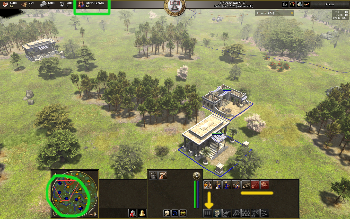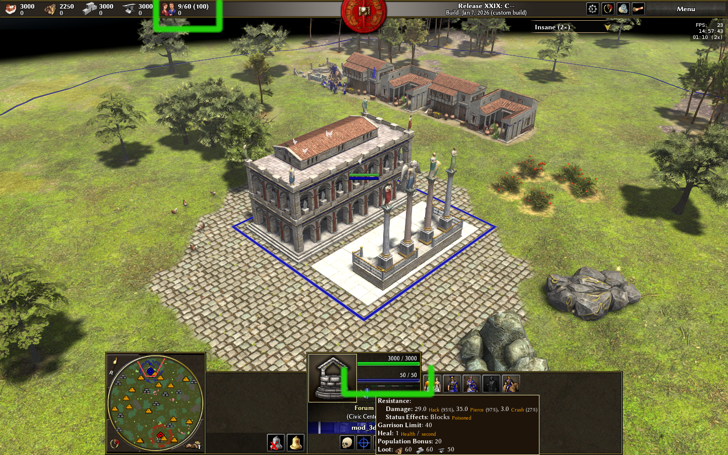 Must be compatible with A27 and R28. The mod changes the gameplay from(1 CivCenter without walls and towers at all stages) to active: The maximum population at the start is limited from 20 to 100 units (configurable before the start of the game). To increase the limit, players build additional CivCenters. Each center increases the limit by +40 units. The upper population limit is only limited by the number of CivCenters that a player can build on the map. Changes for buildings: For all non-military buildings, the number of capture points is reduced to 5-20 (instead of 250 and above). CivCenter: Arrows are disabled! The number of capture points is reduced from 2500 to 50. Arsenal: Built in phase 2. Capture option added for siege units (rams, etc. can be captured by another player in a couple of seconds). Mod support: legacy-of-antiquity.zip