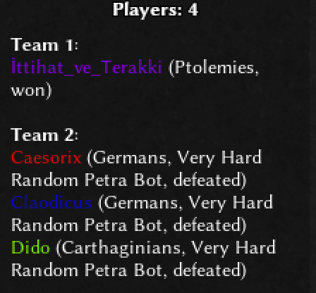 I also have another idea that comes to mind quite often: when defeat is clearly inevitable, Petra should type “gg” and resign. Ragequit behavior could be added as well. Watching it try to rebuild from scratch somewhere on the map with just 4 units against my full army is a bit of a waste of time. You’re welcome. Here’s a new attempt: 1v3 on the same map that I shared earlier. This is the first time I’ve won a 1v3 on Very Hard. The Petras had random civs and random behavior: two Germans and one Carthage. The Carthage Petra could have been much more effective here if it had built siege ships. commands.txt metadata.json