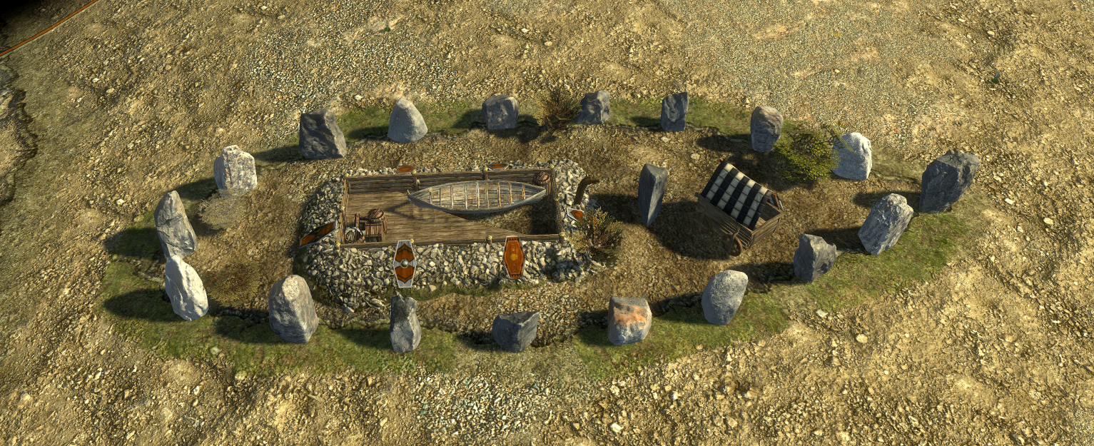 2. WIP. Thoughts? Other than the deletion of unseen faces, any artistic or technical advise? What do you think of this kind of burial chamber? Two stones together (or three at both ends) make up a prop, that adapts to the terrain. Unfortunately the whole concept only works with a lot of props, and this is even without any plants or bushes: What would be an appropiate number of props? Any idea which props are worth to be added? Cadaver of a horse or human corpse, weapons, wagons etc? File's attached. Please test on different biomes and different terrains. stone_ship.zip