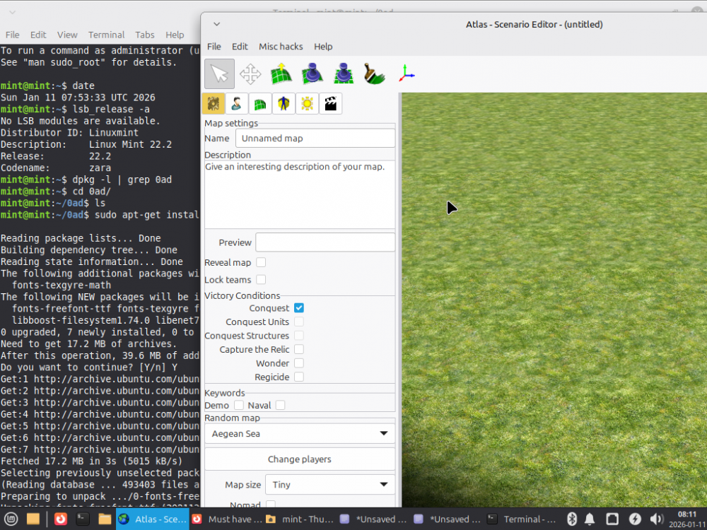 Whew. Deicide4u- yes, youre not kidding! Zyli- thank you again. thats a lot of work! I started with the second method and could not get it to play even though it would load fully to the into screen. So I started from scratch again using the 1st method. I had a lot of the dependency files already downloaded but went thru your instructions exactly anyway. I kept getting dependency errors even though a few were fully downloaded and installed. Ken Wood v.23 fully loads and plays. Everything is installed in my working every day version of Mint 22.2 (not 3) Cinnamon. After a great deal of experimentation I was finally able to get all my customized scenarios and skirmishes transferred from the existing working version in Mint 20.3 It works! I would call this successful, but I now do not have the scenario editor. Error message states it failed to load or is not available. Check the logs. Ive checked the logs and see no reason why. Ive used the scenario editor extensively thru the years and even though it has always been buggy, It worked and served its purpose. So I will just go slow and keep trying to fix this next problem. There is a lot of help work and discussion in this thread. I hope it helps others as well and address a lot of these issues. BTW- again this is used in my new build- A Ryzen 9700x in a Asus B850-i, which is wreaking havoc, as usual, in the Mint communities. -