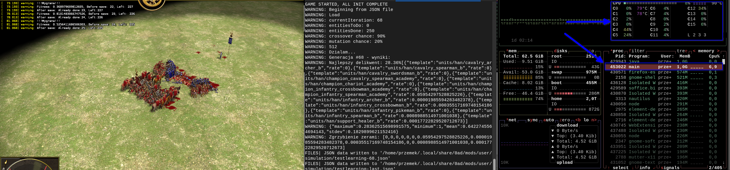 Nope, this is not the issue. Script works correctly. It was just redundancy but didn't affect anything. I removed "TestLearningCommand" so you could see it had nothing to do with this matter. Problem is that --autostart-nonvisual does *something*, but certainly not what user selected with "-autostart". Here are some proofs: --autostart-nonvisual causes high CPU usage and uses all cores. While regular game uses only one thread (~6-7%). My script should generate "debug.json" after start, and about each minute performs the save game. With --autostart-nonvisual nothing happens. Even if we assumed --autostart-nonvisual suppressed all warnings, but still performed map and scripts, I should expect to JSON files and savegame to be created. --autostart-nonvisual uses only ~250Mb of memory. My script after start uses ~1G and after 15min consumes around 5G. It's combat between ~300units performed each 5sec. Screen below pertains --autostart-nonvisual: Certainly pyrogenesis performs some heavy computations on all cores. And selected map is not being run. While this screen below is without -autostart-nonvisual. One core used, JSON files produced, output produced, and all works as intended: I checked on windows and it's same story. The only difference is that if you use --autostart-nonvisual, "Turn (....)" output is not being produced at all, program exits immediately spawning another process. Rest is the same. Spawned process *does something* on all cores, but not running the map that it was asked. -