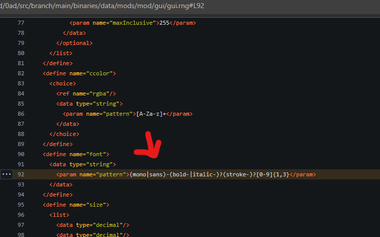 Well like stan said, we have the style.xml file concept so you can create your style file then include in your gui .xml file https://gitea.wildfiregames.com/0ad/0ad/src/branch/main/binaries/data/mods/public/gui/common/styles.xml#L12 https://gitea.wildfiregames.com/0ad/0ad/src/branch/main/binaries/data/mods/public/gui/common/styles.xml#L66 In 0.A.D we have the page concept where you can define what styles to use (you can examine all page_*): https://gitea.wildfiregames.com/0ad/0ad/src/branch/main/binaries/data/mods/public/gui/page_pregame.xml#L4 and after that the real GUI xml https://gitea.wildfiregames.com/0ad/0ad/src/branch/main/binaries/data/mods/public/gui/page_pregame.xml#L15 so when we define any element we use the xml tag "Object" + attrbiute "type" to define what object... and you can apply an style with attrbiute "style" https://gitea.wildfiregames.com/0ad/0ad/src/branch/main/binaries/data/mods/public/gui/page_pregame.xml#L15 or you can explicitly use the "font" attribute if you wan it. Let me know if that help you :). PD: you can test first adding the font you wanna test and replace/add the "font" tag in a particular object to see if that work, after that you can expand the idea with styles.xml and "style" attribute -