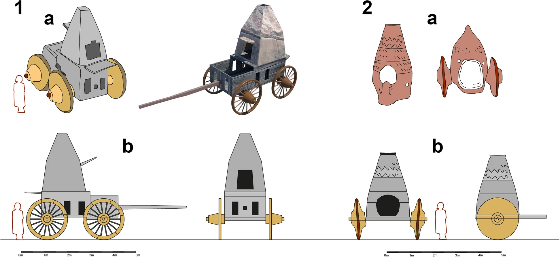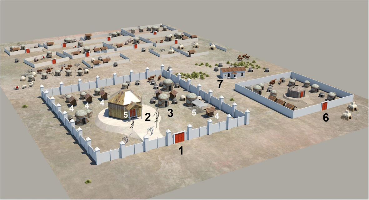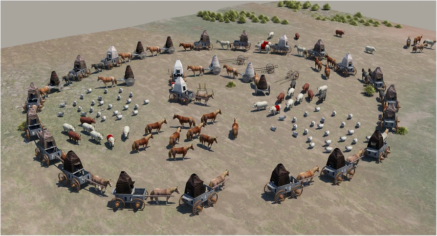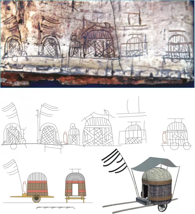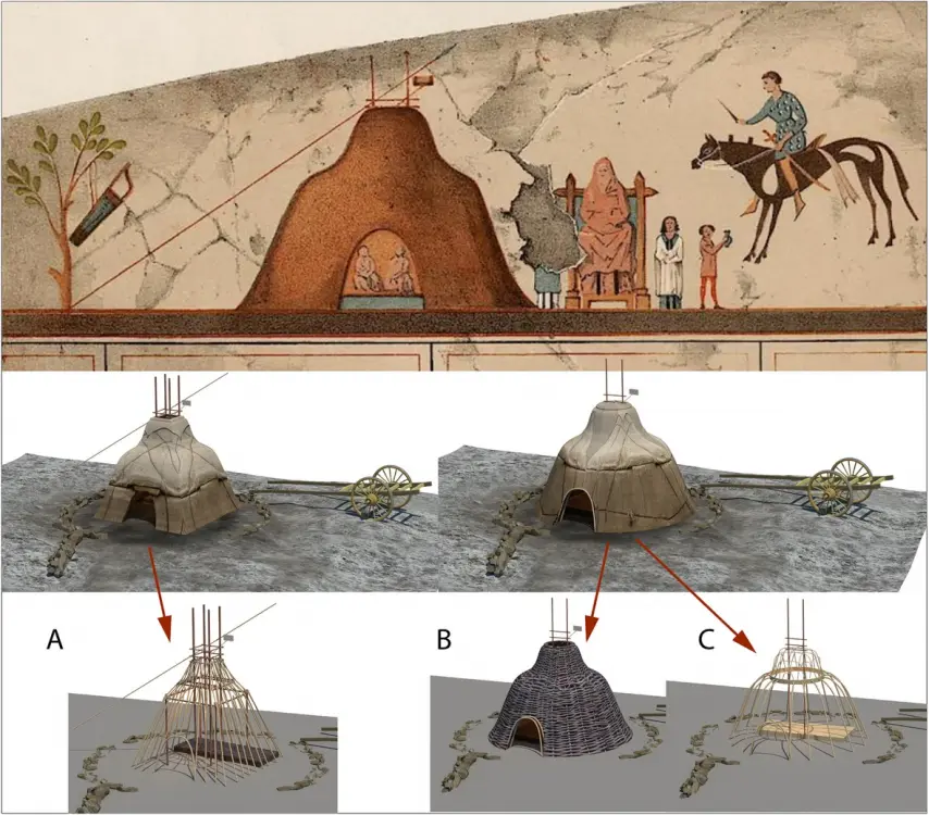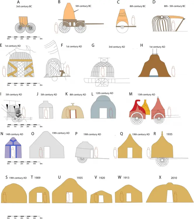 https://built-heritage.springeropen.com/articles/10.1186/s43238-025-00191-2 Inner Asian and Eurasian nomadic camps comprise different types of guyed tents, mobile wood-framed dwellings and carts of various forms. One of the first available depictions originated from the Arjan Bowl, which was found in an Elamite grave in Iran and was dated 800–500 BCE (Majidzadeh 1992). It shows a rib tent (which would be dismantled for transport) with struts and a roof hoop (Fig. 3-D). Greek sources mention Scythian nomads residing in carts, e.g., Hesiod (eighth century BCE), in which Phineus is carried by the Harpies ‘to the land of the men who live on milk and who have their home in wagons’ (Hesiod, The Poems and Fragments (1908, 89, frag. 54). Aeschylus (525–456 BCE) mentioned ‘wattled dwellings, poised high on true wheeled carts’ (Aeschylus 1922, i, 278–279; Andrews (1999, 14) interpreted this passage as indicating that the dwellings were made of a frame woven from twigs or sticks (probably from willow), which was then fixed to the cart and covered by felt. The latter fact was noted by Hippocrates (ca. 460 to ca 377 BCE): Comparison of the shapes and sizes of tents and tent carts from historical finds, depictions or photographs. All tents are scaled to the same size (as far as it was possible to determine the exact size). A Pazyrik cart, real find; (B-C) after clay models; (D) rib tent from the Arjan Bowl; (E-F) Xiongnu carts, birch-bark container in Tsaram; (G) Xiongnu carts, Shancheng coffin painting; (H) Sarmatian tent, tomb of Anthesterius, Crimea; (I) cart from a Tuoba coffin in Datong; (J) Tuoba tent from a grave in Datong; (K) Tibetan tent from a coffin painting in Delingha, Qinghai; (L) Khitan tent from the Wen-Chi scrolls; (M) Cuman carts, Radziwill chronicle; (N) Genghis Khan´s tent, Persian miniature; (O) Kalmyk, 1806 Bertuch Bilderbuch für Kinder; (P) Nogay cart, engraving; (Q) Turkoman tent in Afghanistan, drawing by William Simpson; (R) Chomchugh, refer to the text and Andrews (1999); (S) Kyrgyz kibitka (yurt) drawn by painter Vasily Vereschagin; (T) Avsar tent in Kayseri, photo by Gertrude Bell; (U) Kazakh tent, photo by Owen Lattimore; (V) Mongol yurt/tent, photo from the 1920s; (W) Mongol yurt/tent near Kalgan, photo by Stéphane Passet (1913); (X) Shasavan rib tent, Mount Sabalan, photo obtained in 2010 ‘There too live Scythians who are called nomads because they have no houses but live in wagons. The smallest wagons have four wheels, others six wheels. They are covered with felt and are constructed like houses, sometimes in two compartments and sometimes in three, which are proof against rain, snow, and wind’ [refer to Hippocrates Vol I, De Aere xviii, translated by Jones (1923, 119)]. Models of four-wheeled wagons with tent-like superstructures dated to 600 BCE were found in Kerch in East Crimea. These were made of clay with small windows in their lower structure. The author´s reconstruction is based on such a clay wagon mock-up (Figs. 4, 5). Hippocrates also stated that women and children lived in carts, whereas men spent most of their time on horseback and tended to flock. No depictions of Scythian dwellings (apart from clay models) have been discovered, although in the Pazyrik Kurgan (third century BCE), a complete wooden ceremonial wagon was found. The wagon was preserved exceptionally well and is now on display in the Ermitage in Moscow. Reconstructions (1-2 b) of a Scythian wagon (1) and Mingachevir cart (2) drawn by the author after clay models (1-2 a) Reconstruction of a Scythian wagon camp The first suggestion of tents that represent separate entities and are not part of carts is given with respect to Sarmatians. Strabo (53 BCE to ca. 21 CE) reported, ‘As for the nomads, their tents, made of felt, are fastened on the wagons in which they spend their lives, and round about the tents are the herds which afford the milk, cheese and meat on which they live, and they follow the grazing herd, from time to time moving to other places that have grass…’ (Strabo 1960), vii, 3, 17). Whether these tents fastened to carts were frequently removed and placed on the ground, as the tent components of tent carts in later times would have been, is unclear. There is only one known depiction of a Sarmatian tent, which is set on the ground. It was depicted in a wall painting in a grave chamber in Kerch on the Crimea Peninsula. Unfortunately, it does not exist anymore. Relevant documentation can be found in Minns; Wajnstein (1996) attempted a rectangular reconstruction of the tent. In this work, the author aimed to reconstruct rectangular and round variants, as no definitive hint regarding the ground plan is given in the depiction (Fig. 6). A structural system was also reconstructed, with the following options: A: rectangular variant, 4-post inner structure; B: round variant, woven/wattled structure; C: round variant, rib-tent structure. Depictions of a Sarmatian tent on a wall painting in Crimea (Source: Minns 1913). Shown below are reconstruction possibilities (Source: the author). It is possible to reconstruct the shape as a rectangular (A) or a round tent. For the round variant, a woven/wattled structure (B) or a rib-tent structure with a roof hoop (C) is possible According to Priscus of Panium, who was a diplomatic envoy and therefore eye-witness of the camp of Attila the Hun, Attila’s wife Hereka lived in a circular building with a wooden frame covered in skins or leather. This passage is the only reference in which Hunnic dwellings are described as circular and possessing a wooden frame. However, this passage has been debated as the text is not clear, but recent work (Carolla 2019) supports both the circular shape and skin/leather covering. Elsewhere in the text, Hunnic buildings are described as huts (Greek: kalube), which indicates that they are semipermanent buildings. Alternatively, although they comprise a wooden frame, they could be covered with reeds (