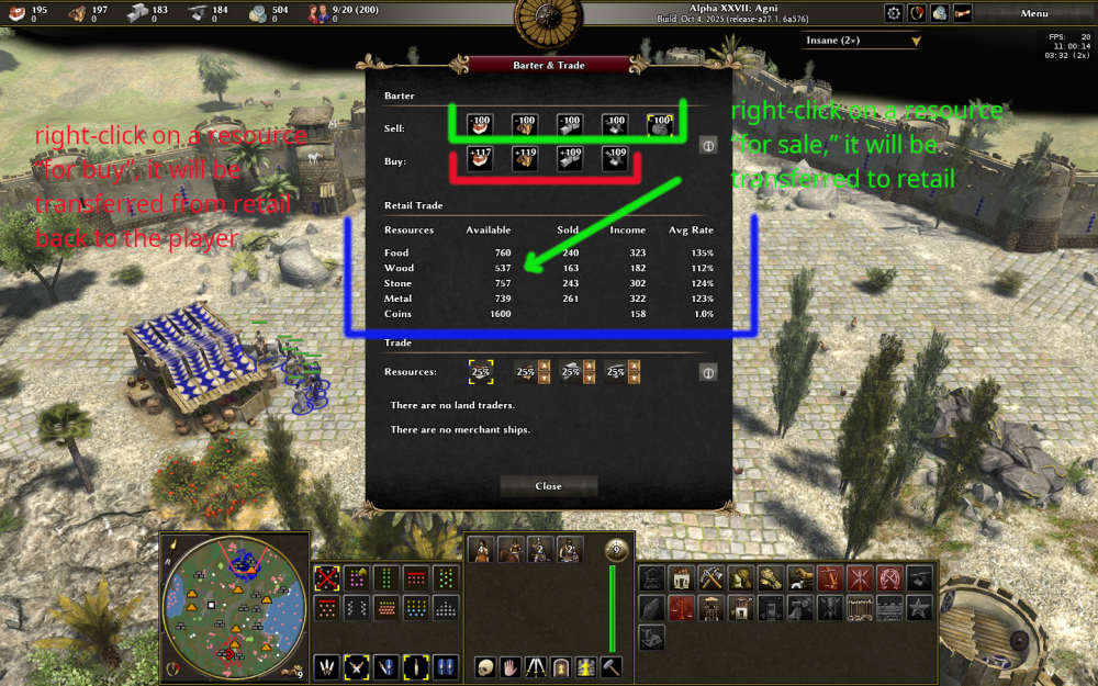 UPDATE: Version 0.10.0 - Added retail trade - Added transfer of coins to deposit with subsequent income - Statistics for retail trade and deposit - Update interval for retail trade and deposit 5 seconds - Barter Multiplier changed to 1.0 for all resources - Income from units and buildings has been reduced by 2 times. Retail Trade: When you right-click on a resource “for sale,” it will be transferred to retail and sold in small batches, but at a more favorable rate. If this resource is Coins, it will be transferred to a deposit and the player will receive interest on the total amount. When you right-click on a resource “for buy”, it will be transferred from retail back to the player. Min amount = 100 - Yesterday
