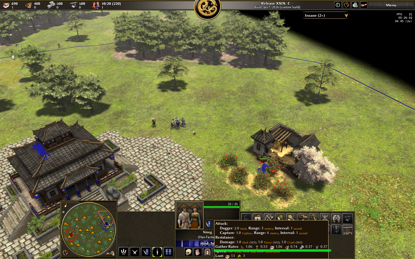 Note: The mod has been tested on version R29 for developers, but should be compatible with A27 and R28. Description: Adds 21 ranks for Support Units. When a certain amount of resources is gathered, the unit's rank increases. Each subsequent rank improves the overall gathering speed for all resources. The bonus and the amount of resources required grows exponentially. Example: Rank Bonus Amount of resources required for improvement 2 +1% 30 3 +3% 45 ... 21 +200% (approximately 15 minutes when gathering fruit, for other resources it takes 2 or more times longer). Ranks are not displayed in the unit interface, only the change in gathering speed. promotion-for-support-units.zip