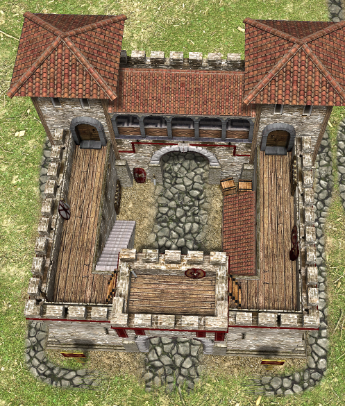 Yeah, I think the negative space in the courtyard in between the cobblestone and the walls would be dirt. Perhaps we can layer decals?