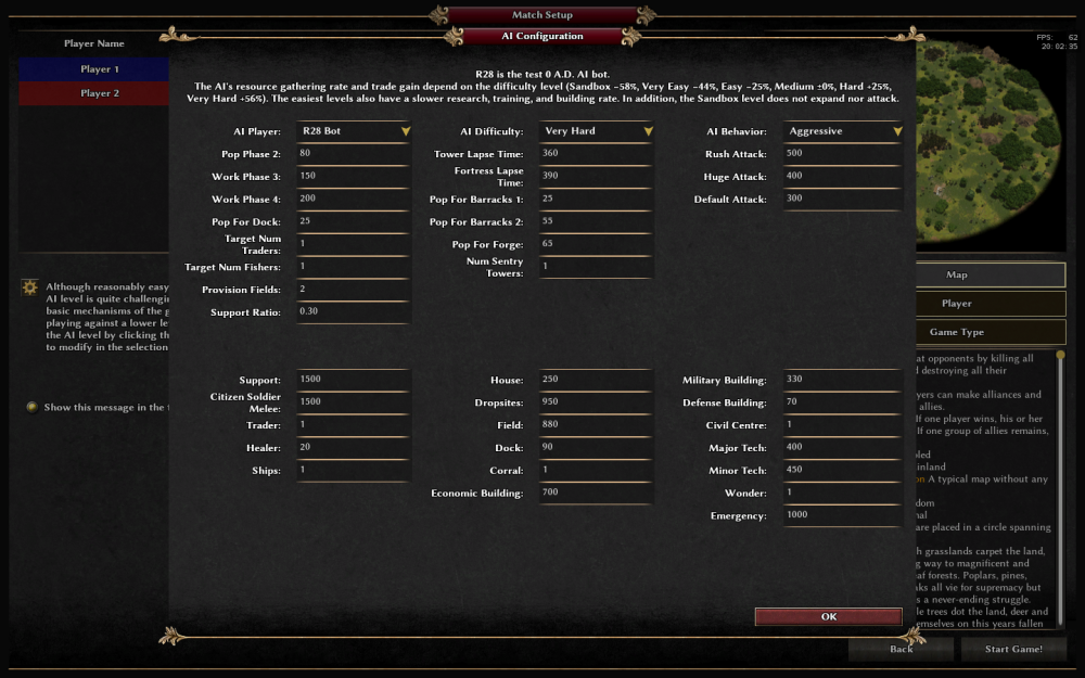 Early access for players testing versions R28 or R29 of the game. It's basically Petra, but with customization options and for game >= R28. Some features from Petra_Expert have been added. Added the ability to customize the bot before starting the game. Values are not saved when exiting the game or returning to the previous menu. More detailed description of parameters: Added the ability to recruit support units from houses. The number of barracks has been increased to 5. The Research Manager has been slightly redesigned (instead of searching for technologies in a cycle, all technologies are stored in the cache and selected by a direct key: name or modifier by 1 step, the cache is updated when moving to the next phase or after the construction of a building is completed). Technologies from the Storehouse, Forge, and Champions remain in place, while the rest are currently disabled. With certain settings, the bot can reach up to 200 units in 11-12 minutes of play. Mod support: r28-bot.zip