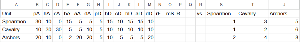2. Well, it's not to completely negate, but acts as a modifier. Thus, you have values of pierce (p), hack (h), crush (c), block (b), parry (a) and dodge (d), both for attack (A) and defense (D): pA, hA, cA, bA, aA, dA, pD, hD, cD, bD, aD, dD. For example, aA is how hard is to parry its attack, aD is how easily it parries attacks. The better for the unit the bigger the values are. As a proof of concept, a naive formula for the damage the attacker deals to a defender could be (pA/pD+hA/hD+cA/cD)(bA/bD)(aA/aD)(dA/dD), meaning that all damage, after being divided by each corresponding defender's resistance, is added up, and then multiplied by factors related to the probability (it's NOT directly a probability) of the attack being either blocked, parried or dodged (just adding them up is problematic). Here I'm showing the (rounded) results, with 10 taken as an average value, and other parameters like rate of fire, movement speed and range not yet taken into account: This means that the damage ratio for spearmen:cavalry is 3:1 (as wanted), for cavalry:archers is 6:4 (which makes sense, cavalry would get destroyed by archers if they don't close in, like in Agincourt), and for archers:spearmen is 2:5 (which makes sense, the advantage of archers being not this but keeping their distance). Remember that rate of fire, movement speed and range not yet taken into account, which would incline more the scales to what is wanted. Also, archers:archers is 4 times more destructive than cavalry:cavalry, which is twice as destructive as spearmen:spearmen, which makes sense considering how long these kind of engagements last. Would be nice to keep adding units.